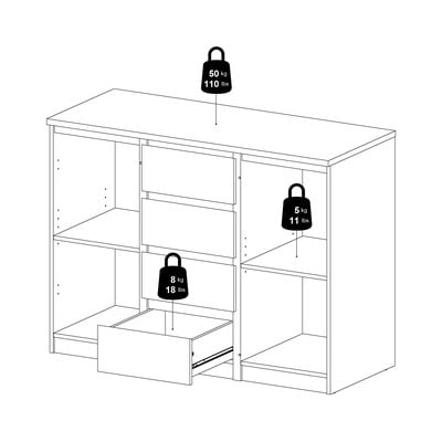 S rozměry 121x91x50 cm nabízí dostatek prostoru pro vaše věci. Čtyři zásuvky uprostřed poskytují snadný přístup k často používaným předmětům, zatímco dvě boční dvířka skrývají dva nastavitelné regály pro flexibilní uložení.