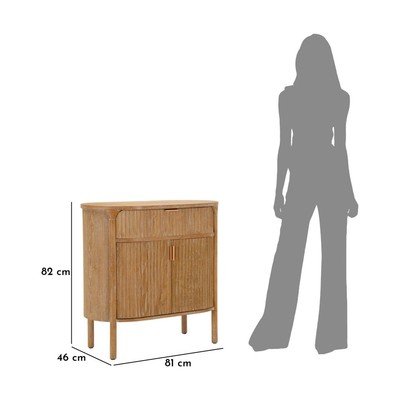 Komoda je vybavena jednou horní zásuvkou s vnitřními rozměry 56,5 x 34 x 12 cm a dvěma dvířky ve spodní části, které nabízejí dostatek úložného prostoru.