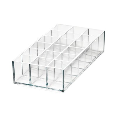 Nabídne osmnáct přihrádek pro přehledné uložení rtěnek a lesků na rty. Díky transparentnímu provedení a absenci víka rychle vyndáte to, co zrovna potřebujete.