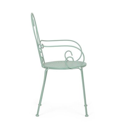 Zahradní židle Etienne od značky Bizzotto. Odolný kovový materiál a unikátní tvar opěradla s propracovanými detaily ji činí ideální volbou pro venkovní relaxaci.