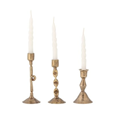 Svícny Efsa od značky Bloomingville tvoří sadu tří kovových svícnů, které vynikají svým jemně patinovaným povrchem. Každý kus má jedinečný design a odlišný tvar, což dodává celé sadě osobitý charakter.