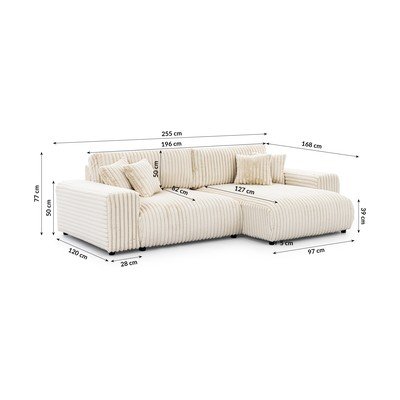 Manšestrová, rozkládací/s úložným prostorem, pravý roh, krémová, voděodolná/odolné vůči skvrnám, trojmístná, šířka 255 cm