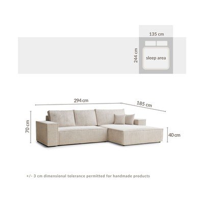 ŽinylkováRozkládací/s úložným prostoremPravý roh/s lenoškouKrémováČtyřmístnáŠířka 294 cmHloubka 185 cmHloubka sedáku 65 cm
