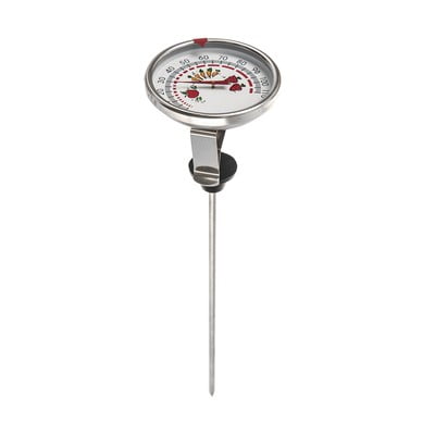Ciferník je navíc ozdobený ovocem, které poukazuje na teplotu potřebnou k jeho zavaření. Pro snadné označení požadované teploty je teploměr vybaven posuvnou červenou šipkou na okraji.
