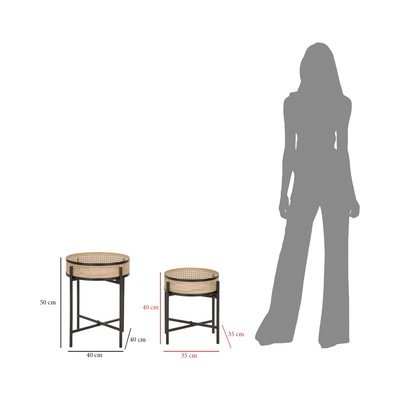Sada odkládacích stolků Fuji od značky Mauro Ferretti je skvělým doplňkem do vašeho interiéru. Obsahuje dva kulaté stolky s kovovou konstrukcí a integrovanými košíky s proutěným výpletem, které poslouží jako praktický úložný prostor nebo stylový prvek pro vystavení dekorací.