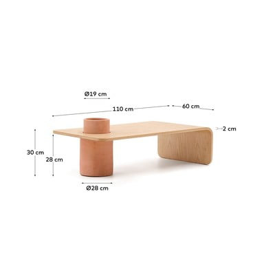 Konferenční stolek Olaria od značky Kave Home v sobě originálně propojuje přírodní krásu dřeva a terakoty. Zaoblený stolek s rozměry 110 x 60 cm je vyroben z jasanové dýhy v přírodním odstínu a disponuje originálním terakotovým otvorem, který poslouží například jako květináč.
