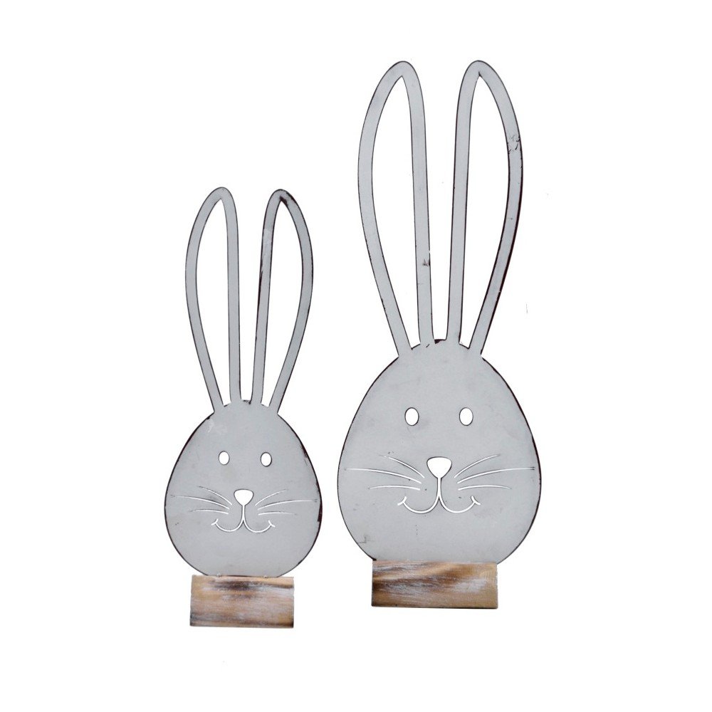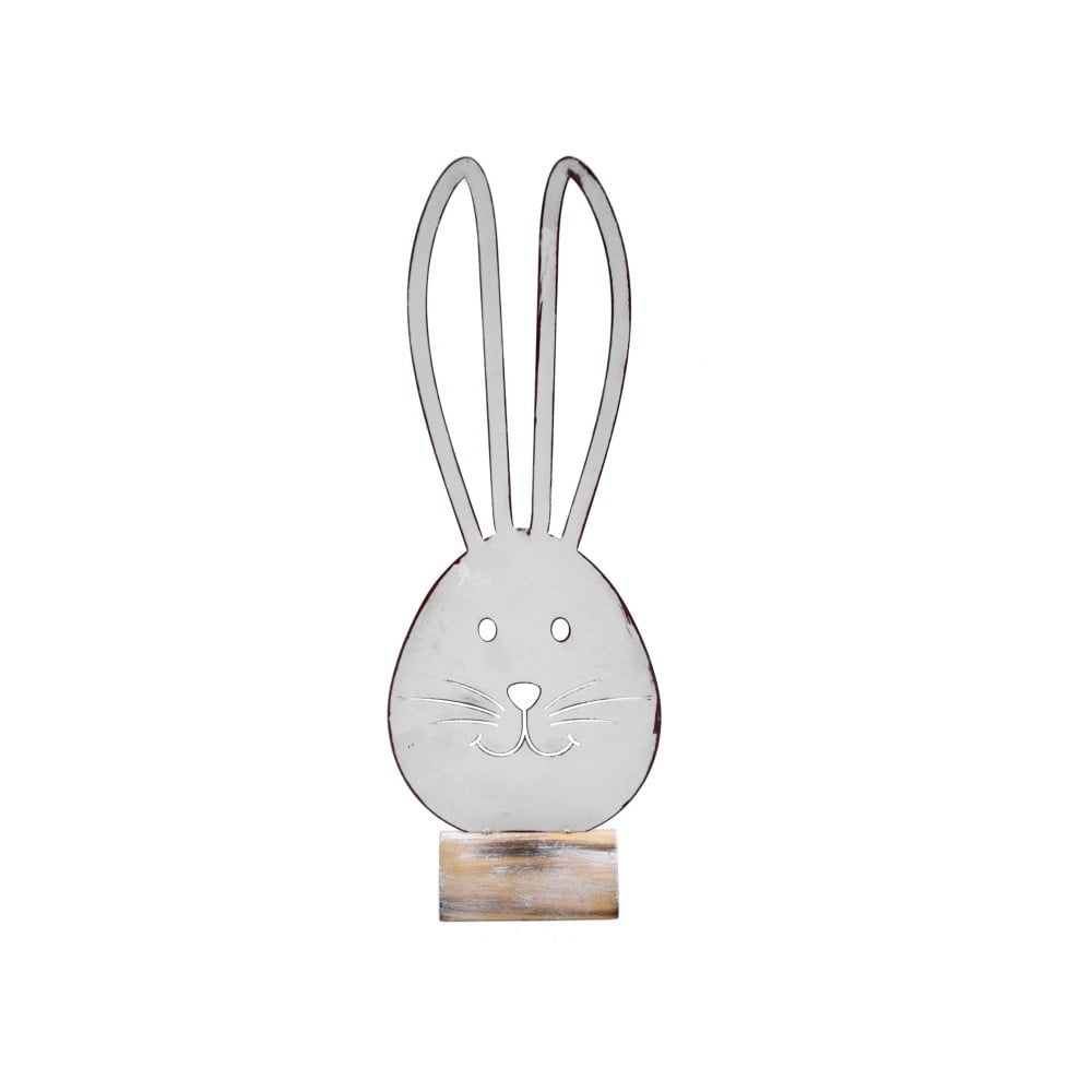 Malá bílá kovová dekorace s motivem zajíce na dřevěném podstavci Ego Dekor, 12 x 34 cm