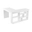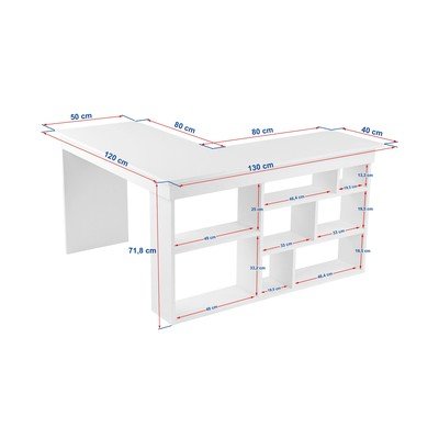 Rohový pracovní stůl Vesper od značky Kalune Design. Díky svému L-tvaru a integrovaným policím nabízí praktický úložný prostor a efektivní využití místa.