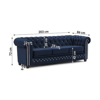 Sametová, rozkládací, chesterfield, modrá, voděodolná/odolné vůči skvrnám, dvoumístná, šířka 203 cm