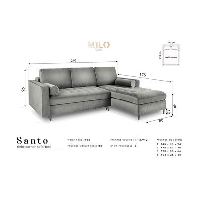 Rohová rozkládací pohovka Milo Casa Santo se sametovým povrchem poskytne skvělý odpočinkový prostor pro celou rodinu a dodá interiéru špetku luxusu. Tkaniny, které tato značka používá jsou podrobeny náročným testům, aby zaručily špičkovou odolnost, komfort i atraktivní styl. Na potah této pohovky byla tedy použita krásná látka s mírným leskem a krátkým vlasem, která je velmi příjemná na dotek a také velmi odolná proti oděru. Technika Liquid Blocked použitá na tkanině znesnadňuje vstřebávání tekutin, tedy způsobuje, že se tekutina shromažďuje na povrchu materiálu, aniž by pronikla hluboko do vláken. Díky tomu se káva, čaj nebo víno nalité na látku odstraní během pár sekund přiložením lehce savého hadříku nebo papírové utěrky.
