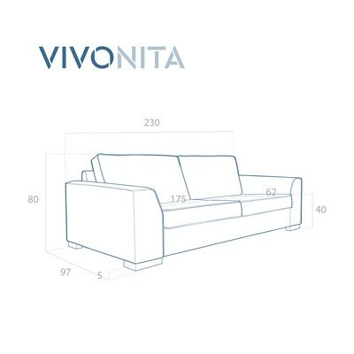 SametováŠedáTrojmístnáŠířka 230 cmHloubka 97 cmHloubka sedáku 62 cm