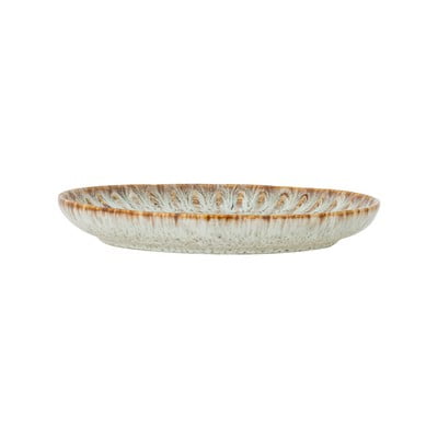 Jeho jednoduchý design a glazovaný povrch vytvářejí harmonický dojem. Díky povaze glazury je každý kus naprostý originál. Talíř má kruhový tvar a výrazný vzor, který se rozprostírá od středu k okrajům a připomíná jemné, peříčkové struktury.