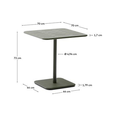 Jídelní stůl Brai od značky Kave Home je praktickým a stylovým doplňkem pro váš domov i zahradu. Jeho čtvercová deska s podélnými drážkami spočívá na pevné centrální noze a stabilní základně.