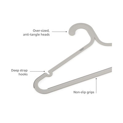 Háčky ramínek Orderly jsou ploché a velké, díky čemuž se snadno nasazují a snímají z šatní tyče. Jejich tvar navíc zabraňuje překrývání a zachytávání ramínek nebo oblečení. Silikonové protiskluzové plochy na ramenou a tyčce na kalhoty zajišťují stabilitu oděvů. Hluboké háčky slouží k pohodlnému zavěšení ramínek šatů a poutek sukní.