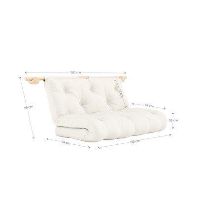 Pohovka je vybavena čtyřmi nástěnnými držáky, které ji bezpečně drží na místě a zároveň umožňují, aby fungovala jako dekorativní prvek v místnosti. Pro sezení jednoduše přesuňte pohovku do nižší polohy. Potřebujete-li místo na spaní, stačí rozložit matraci na podlahu. Držáky lze instalovat v různých místnostech, což umožňuje přesouvat pohovku podle potřeby. Konstrukční tyč je široká 180 cm.