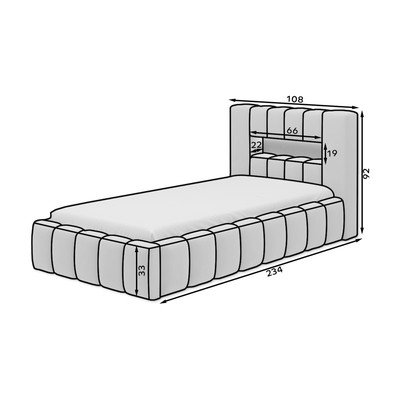 Dobré vědět: Polička v čele postele je 19 cm vysoká a 20 cm hluboká, ale kvůli měkkým okrajům se její rozměry mohou lišit až o 2 cm.