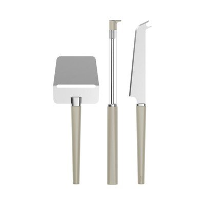 V sadě najdete klasickou škrabku na sýr, která je ideální pro tvrdé sýry a její široká čepel s ostrou hranou snadno odkrojí tenké plátky. Dále je zde kráječ na sýr s drátkem, jehož horní část je tvarována malou vidličkou pro snadné zachycení plátku. Třetím nástrojem je nůž na sýr, který si poradí jak s velmi měkkými, tak s velmi tvrdými sýry. Jeho ostrá hrana vede až ke špičce pro přesné řezy a charakteristická vidlička na špičce slouží k přenášení sýrových kousků.