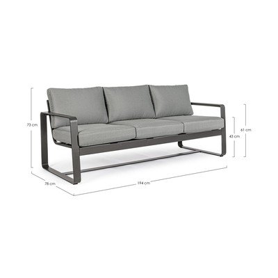 Pohovka s jednoduchým rámem z odolného hliníku je doplněna o pohodlné polštáře v neutrální šedé barvě, které dotváří její minimalistický vzhled. Díky použití hliníku je pohovka lehká a zároveň odolná vůči povětrnostním vlivům.
