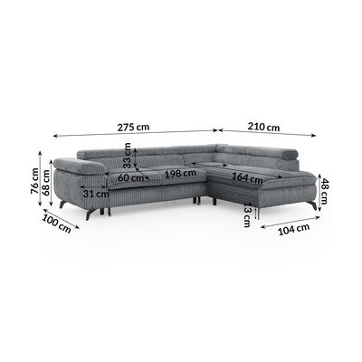 ManšestrováPolohovací/rozkládací/s úložným prostoremPravý roh/do LVhodné pro mazlíčky/odolné vůči skvrnámŠedáČtyřmístnáŠířka 275 cmHloubka 210 cmHloubka sedáku 60 cm
