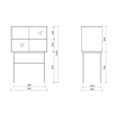 Hlavní úložný prostor je chráněn posuvnými dveřmi, z nichž jedna je částečně neprůhledná, což umožňuje diskrétní uložení obsahu a zároveň dodává vitríně zajímavý vzhled. Uvnitř najdete praktické police pro uspořádání vašich věcí.