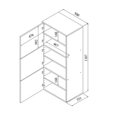 Z dřevotřískyPovrchová úprava: melaminMatnýV přírodní barvěPočet párů bot 18 Šířka 50 cmVýška 119 cmHloubka 33 cm