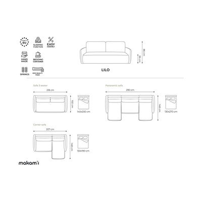 Rohová pohovka do U Lilo od značky Makamii. Nabízí praktický úložný prostor a snadno ji rozložíte pro příležitostné přespání.