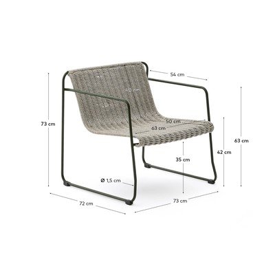 Zahradní křeslo Maurina od značky Kave Home. Ručně pletený výplet z lana je odolný vůči UV záření a pozinkovaná ocelová konstrukce je rezistentní proti korozi, což zaručuje stoprocentní venkovní použití.
