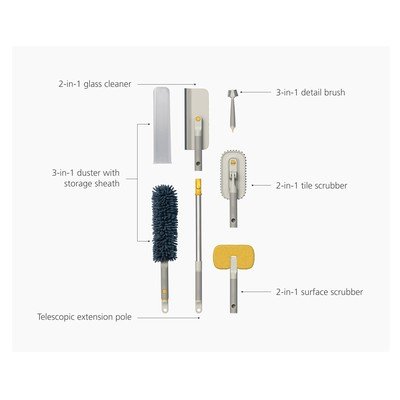 Sada na úklid CleanTech od značky Joseph Joseph je praktickým šestidílným pomocníkem pro celou domácnost. Díky teleskopické tyči, která je nastavitelná v rozsahu od 61 do 86 cm, snadno dosáhnete i na hůře dostupná místa.