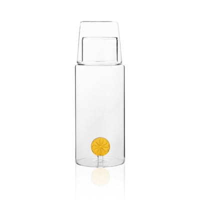 Její minimalistický design doplňuje praktický skleněný kalíšek, který slouží zároveň jako víčko. Karafa má na dně zajímavý detail v podobě plátku citronu.