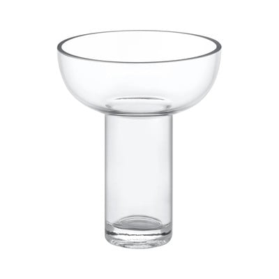 Tato ručně vyrobená skleněná váza se vyznačuje originálním tvarem, který kombinuje širokou miskovitou horní část s pevnou válcovou základnou. Díky svému čistému designu a transparentnímu provedení se stane decentním, avšak nepřehlédnutelným prvkem vašeho domova.