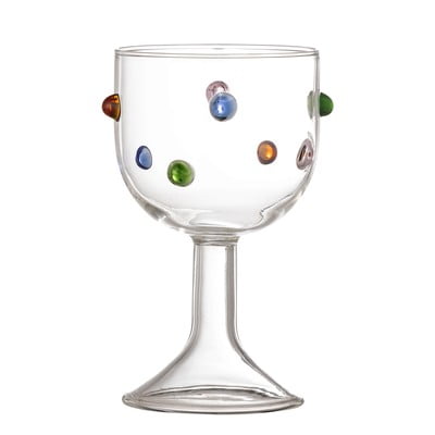 Tato sklenička je ručně foukaná a zdobená barevnými skleněnými kuličkami, které dodávají vašemu stolování zábavný a barevný nádech. Sklenice má objem 250 ml.