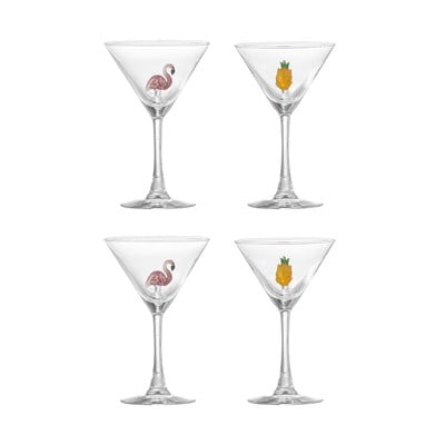 Sada obsahuje dva kusy s motivem plameňáka a dva s motivem ananasu. Každá sklenice je jedinečná díky ruční výrobě a foukání. Sklenice jsou ideální pro servírování koktejlů.