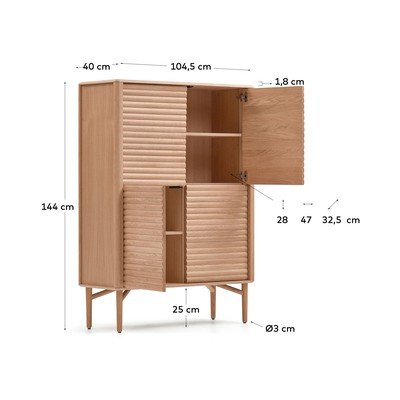 Její čtyři dveře jsou opatřeny zajímavým horizontálním reliéfním vzorem a praktickým systémem otevírání pouhým zatlačením. Celý kus nábytku stojí na subtilní dřevěné podnoži, která podtrhuje jeho moderní estetiku.
