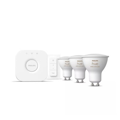 Philips Hue obsahuje vše, co potřebujete k vytvoření chytrého osvětlení ve vašem domově. Sada zahrnuje Hue Bridge, tři chytré žárovky a vypínač se stmívačem, který vám umožní začít ihned ovládat světla podle vašich představ.