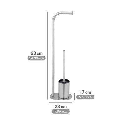 Tento volně stojící ocelový doplněk elegantně kombinuje držák na toaletní papír s integrovanou WC štětkou. Štětka je umístěna v samostatné nádobce na základně stojanu a její hlava má průměr 7,5 cm.
