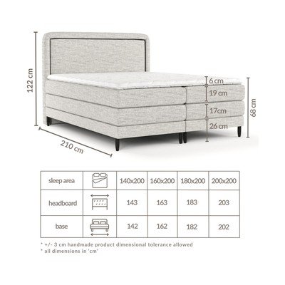 Tato boxspring postel vzhledem ke dvěma typům matrací umístěných ve čtyřech samostatných částech poskytne nezaměnitelné pohodlí. Zatímco spodní matrace o výšce 17 cm sestává z bonellových pružin a polyuretanové pěny, horní matrace o výšce 19 cm je vyrobena z taštičkových pružin umístěných v individuálních kapsách.