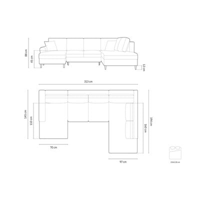 Sametová, rozkládací/s úložným prostorem, pravý roh/do "U", světle modrá, vícemístná, šířka 313 cm