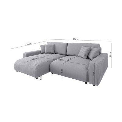Manšestrová, rozkládací/s úložným prostorem, pravý roh/levý roh/variabilní roh/s lenoškou, světle šedá, trojmístná, šířka 234 cm