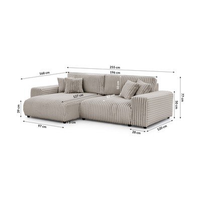 Manšestrová, rozkládací/s úložným prostorem, levý roh, světle šedá, voděodolná/odolné vůči skvrnám, trojmístná, šířka 255 cm