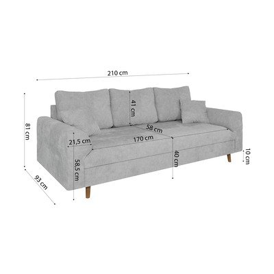 Žinylková, šedá, trojmístná, šířka 210 cm, hloubka 93 cm, hloubka sedáku 41 cm