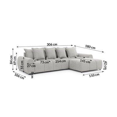Pravý roh/s lenoškouSvětle šedáVoděodolná/odolné vůči skvrnámČtyřmístnáŠířka 306 cm