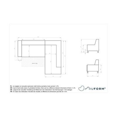 nohy z bukového dřeva a sedáky potažené látkou s osobitým prošíváním. Disponuje