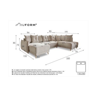 ManšestrováRozkládací/s úložným prostoremPravý roh/do "U"Tmavě modráVícemístnáŠířka 320 cmHloubka 191 cmHloubka sedáku 58 cm