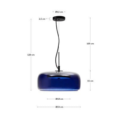 Tmavě modré závěsné svítidlo Reig se skleněným stínidlem o průměru 38 cm od značky Kave Home je vybaveno integrovaným LED světlem o výkonu 10 W. Můžete ho kombinovat s dalšími produkty ze stejné kolekce.