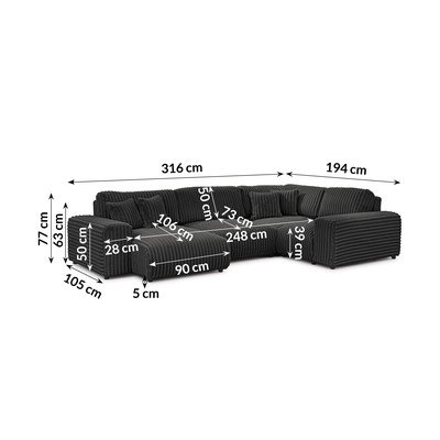 ManšestrováPravý roh/do "U"Tmavě šedáVoděodolná/odolné vůči skvrnámČtyřmístnáŠířka 316 cm