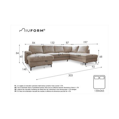 SametováRozkládací/s úložným prostoremPravý roh/do "U"Tmavě šedáVícemístnáŠířka 303 cmHloubka 197 cmHloubka sedáku 57 cm