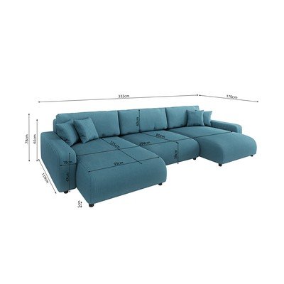 Manšestrová, rozkládací/s úložným prostorem, do "U", tyrkysová, vícemístná, šířka 332 cm