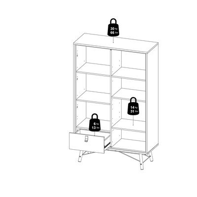 S rozměry 102x162x40 cm nabízí dostatek úložného prostoru díky dvěma dvířkám, jedné zásuvce a pěti policím. Levá prosklená část s policemi umožňuje vystavit dekorace, zatímco pravá část s dvířky poskytuje diskrétní úložný prostor. Černé kovové nohy zajišťují stabilitu a podtrhují moderní design.