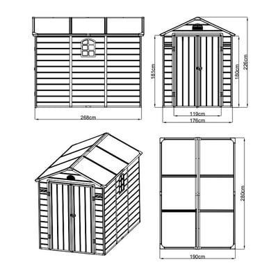 Vzhledem k vysoce kvalitnímu plastovému materiálu je tento zahradní domek od značky Rojaplast charakteristický lehkostí a odolností, a to i proti UV záření a povětrnostním vlivům. O potřebnou pevnost celé konstrukce se postarají kovové výztuhy, vnější plastové panely (12 mm) a plastové sloupky (1,5 mm).