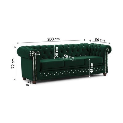 Sametová, rozkládací, chesterfield, zelená, voděodolná/odolné vůči skvrnám, dvoumístná, šířka 203 cm